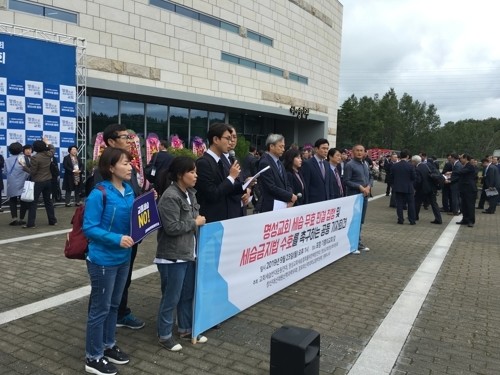 교계 단체들은 23일 총회장 앞에서 기자회견을 열어 김삼환 목사를 비판하고 이번 총회에서 서울동남노회 수습전권위원회가 내놓은 중재안에도 반대한다는 뜻을 밝혔다.