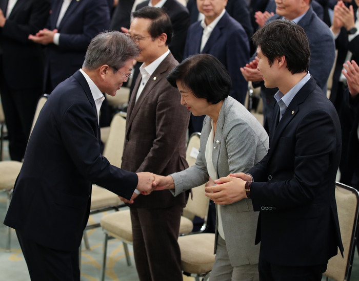 | ▲ 문재인 대통령이 1일 오전 청와대 영빈관에서 열린 당·정·청 전원회의에 입장하다 더불어민주당 추미애 전 대표와 인사하고 있다. [연합뉴스 제공] |