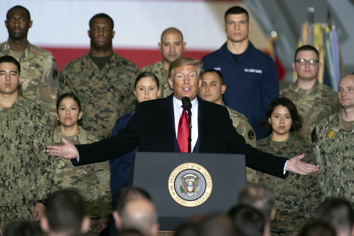 도널드 트럼프 미국 대통령이 20일(현지시간) 워싱턴DC 근교 앤드루스 공군기지에서 2020회계연도 국방수권법(NDAA)에 서명하기 전 연설하고 있다. 연합뉴스 제공