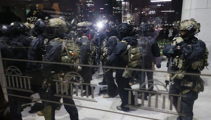 ▲ 윤석열 대통령이 3일 밤 비상계엄을 선포한 가운데 4일 자정께 서울 영등포구 여의도 국회 본관으로 계엄군이 진입 준비를 하고 있다. 2024.12.4 연합뉴스 제공