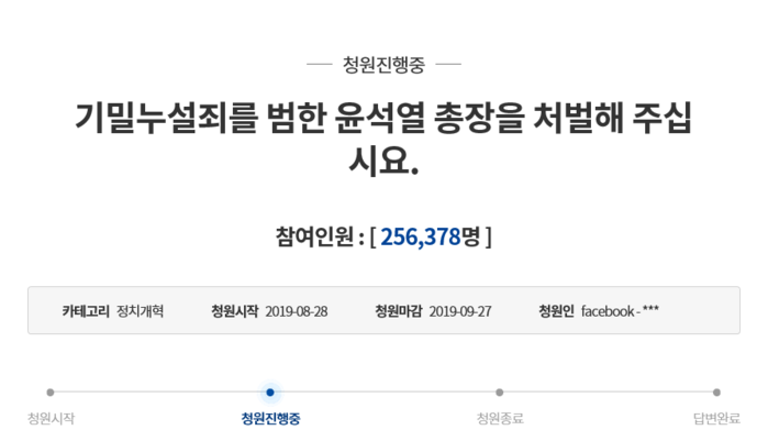 검찰이 조국 법무부장관 후보자의 부인 정모 교수를 피의자 조사 없이 기소한 가운데 "윤석열 검찰총장을 처벌해 달라"는 청와대 국민청원 게시판에 따르면 이날 낮 12시 이 청원의 참여인원은 25만 6천여명을 돌파했다.