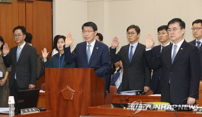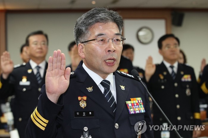 | 민갑룡 경찰청장이 4일 오전 서울 서대문구 경찰청에서 열린 국회 행정안전위원회의 경찰청 국정감사에서 선서하고 있다. |
