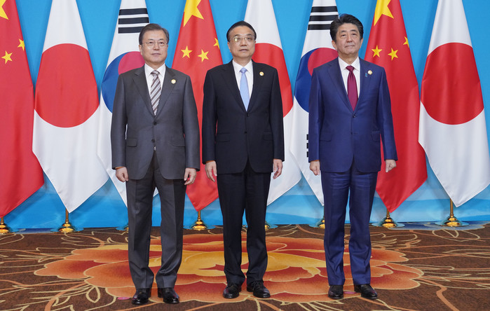 문재인 대통령과 리커창 중국 총리, 아베 일본 총리가 24일(현지시간) 쓰촨성 청두 세기성 국제회의센터에서 열린 정상회의 전 기념촬영을 하고 있다. 2019.12.24 연합뉴스 제공