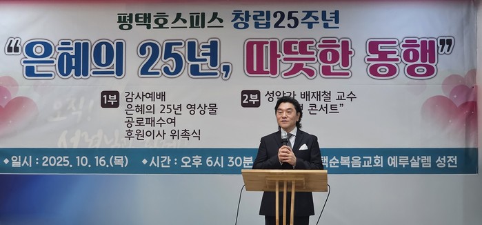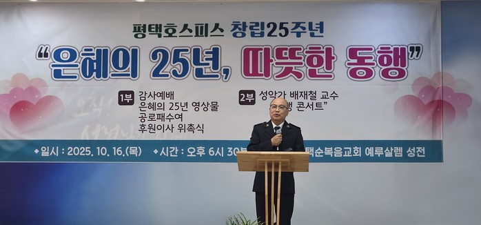 평택호스피스선교회(이사장 배창돈 목사. 대표 박종승 목사)는 지난 2025년10월16일(목)오후6시30분 평택순복음교회(담임목사 강헌식, 경기도 평택시 서재 11로 40) 예루살렘 성전에서 정장선 평택시장과 서현옥 경기도의회 의원. 강정구 평택시의회 의장 등 100여명의 내빈이 참석한 가운데 평택호스피스선교회 25년의 은혜, 창립 25주년 감사예배를 성대하게 열고 마쳤다.