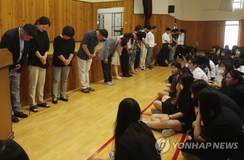 지난 6월 25일 오후 전북 전주시 완산구 완산여자고등학교 강당에서 박창석 교장을 비롯한 교사 20여명이 학교법인 완산학원에서 발생한 횡령 사건과 교사 부정 채용 사건에 대해 학생들에게 사과하고 있다.