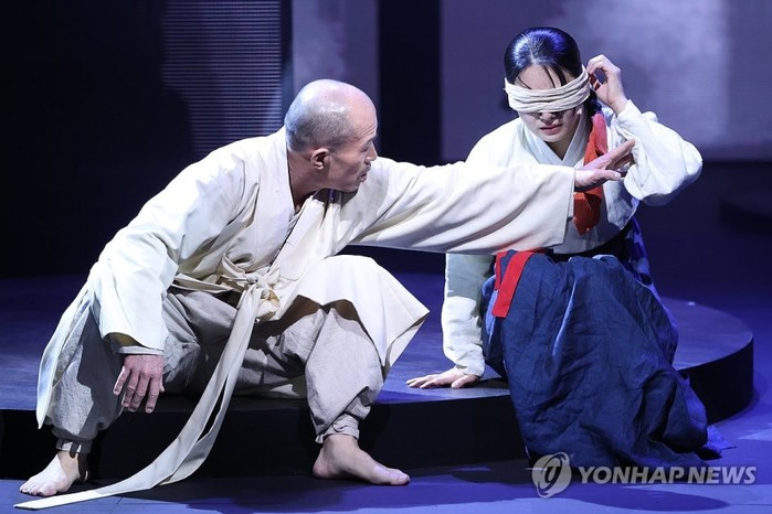 특히 아버지가 딸의 눈을 멀게 하는 극중 설정을 그대로 살려 문학적 정체성을 강조했다. 이는 현대적 시각으로 평가하기보다는 원작의 ‘비정하고 폭력적인’ 캐릭터로서 의미를 부여했다. 22곡의 판소리와 소리를 원작에 기반해 인물 감정과 극적 상황에 맞춰 재배열한 점도 이번 공연만의 차별점이다. 예컨대 ‘아비’의 죽음 장면에서는 ‘춘향가’ 중 ‘이별가’를 활용해 이별의 슬픔과 재회의 염원을 담아냈다.