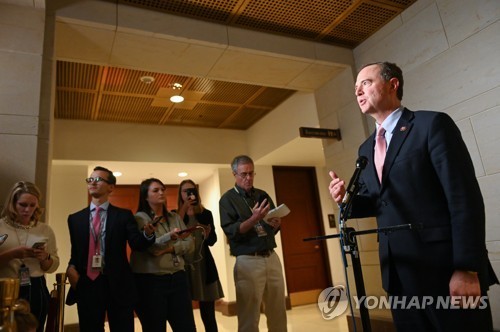 | ▲ 도널드 트럼프 미국 대통령에 대한 탄핵 조사를 주도하는 미 하원 정보위원회의 애덤 시프 위원장이 워싱턴 의회의사당에서 기자들에게 발언하고 있다. |