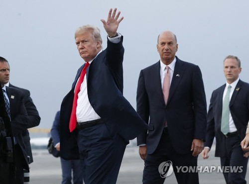 | ▲ 도널드 트럼프 미국 대통령(왼쪽)과 고든 선들랜드 유럽연합(EU) 주재 미국대사(오른쪽)가 벨기에 브뤼셀 현지 공군기지에 도착한 모습. |