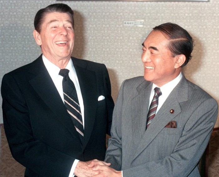 ▲ 일본 현대 정치사의 산증인인 나카소네 야스히로(中曾根康弘) 전 일본 총리가 29일 별세했다. 향년 101세. 사진은 1983년 11월 도쿄 총리관저에서 열린 미일정상회담에서 로널드 레이건 당시 미국 대통령과 웃으며 악수하는 나카소네 전 총리. 연합뉴스 제공