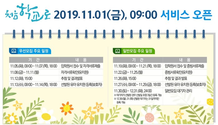 교육부는 17일 제14차 교육신뢰회복 추진단 회의를 개최하고, 2020학년도 유치원 신입생 모집을 위한 온라인 입학관리시스템인 '처음학교로' 학부모 서비스를 11월 1일부터 시작한다고 안내했다.