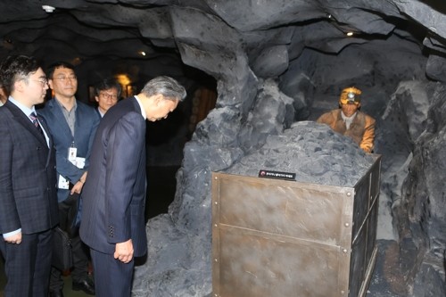 탄광 노동자 모형 앞에서 고개 숙여 사과