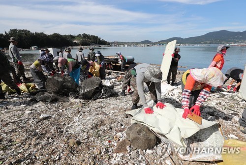 복구 작업에 투입된 장병과 공무원들은 부러진 가두리 조각과 폐스티로폼을 일일이 마대 자루에