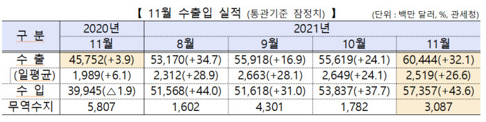 올해 11월 수출이 월간 기준 사상 처음 600억 달러를 돌파하며 역대 최고치를 기록했다.