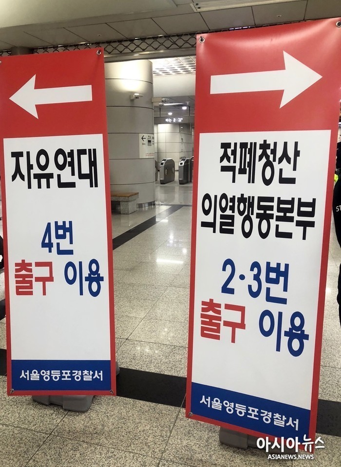 국회의사당역 지하에는 '적폐청산 의열행동본부 2·3번 출구 이용', '자유연대 4번 출구 이용'이라고 적힌 친절한(?) 푯말이 등장해 눈길을 끌었다.