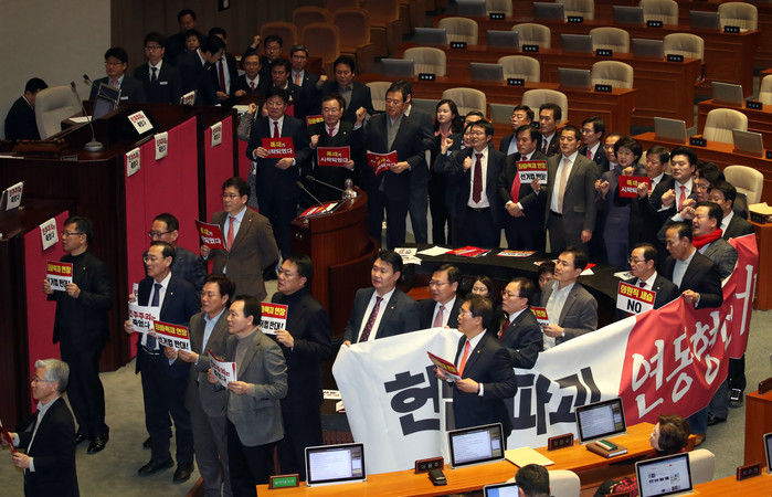 회의가 예정된 오후 3시보다 약 5분 앞서 본회의장에 들어선 한국당 의원 30여명은 국회의장석 연단 앞에 '대한민국을 밟고 가라' '공수처법 연동형 비례대표제 절대 반대' 등의 문구가 쓰인 플래카드를 펼쳐 세우고 농성을 시작했다. 본회의 개의가 지연되는 가운데 여야 의원들 사이 말싸움도 오갔다.