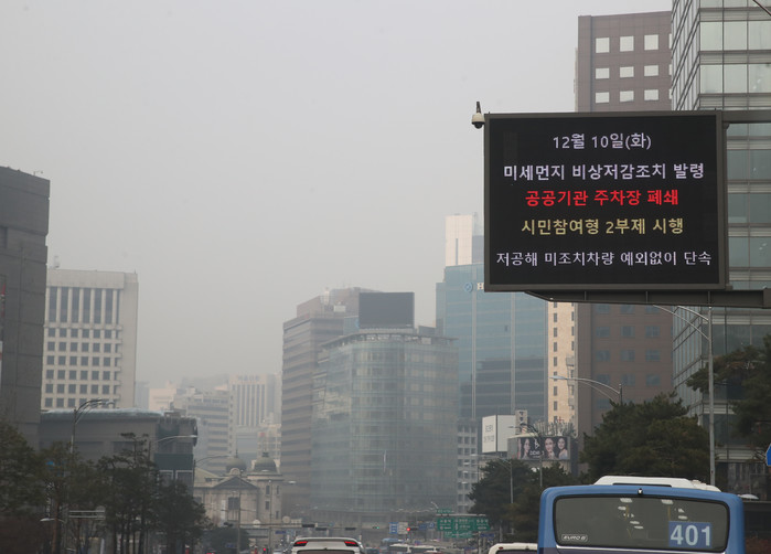 ▲ 서울 지역에 초미세먼지 주의보가 발령된 10일 서울 중구 회현사거리 인근 교통안내전광판에 미세먼지 비상저감조치 발령 관련 문구가 표시되고 있다. 연합뉴스 제공
