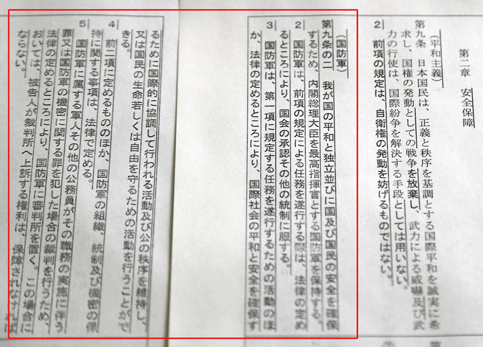 아베 총리가 총재를 겸직하는 집권 자민당은 앞서 '전쟁 포기'와 '전력 보유 금지'를 규정한 헌법 9조 1항과 2항을 그대로 두고 '국방군'이라는 형태로 자위대의 존재를 반영하는 내용을 추가하는 개헌안을 제시한 바 있다.