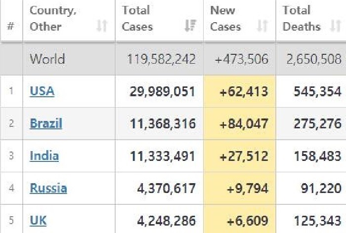13일 복수 이상의 브라질 현지 매체들은 최근 인도의 코로나19 일일 신규 확진자가 하루 2만명대 수준으로 크게 감소하면서 누적 확진자수 순위 기준 3위에 올라있던 멕시코가 인도를 제치고 2위로 올라서게 됐다고 전했다. 1위는 미국으로 누적 확진자 수는 2900만명 수준이다.